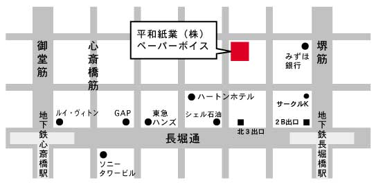 平和紙業 / ペーパーボイス・ギャラリー 大阪市中央区南船場2-3-23 TEL 06-6262-0902 地下鉄「長堀橋駅」から徒歩5分程です。 (地下鉄・堺筋、長堀鶴見緑地線/長堀橋駅下車)