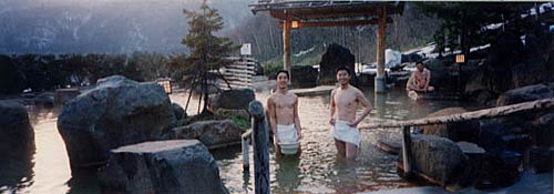 札幌の郊外にある定山渓温泉の露天風呂です。左はデザイナーの細井君です。右奥のあぐらで 座っているのは地元のおじさんでした。ここを拠点にサッポロ国際、ルスツ、ニセコなどに レンタカーを借りて滑りに行きました。 back next