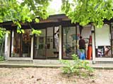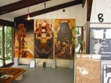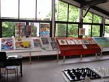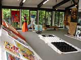 展示風景、緑に囲まれたアトリエは三面ガラス張りで素晴らしい空間だ。(搬入直後の会場内) ワタシは大阪での展覧会で描いた作品を展示した。