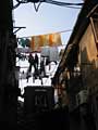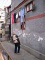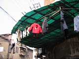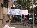 街の至る所に洗濯物が干してある。電線、街路樹、歩道の上、どこでもあり。 これは布団を歩道の上に干していて